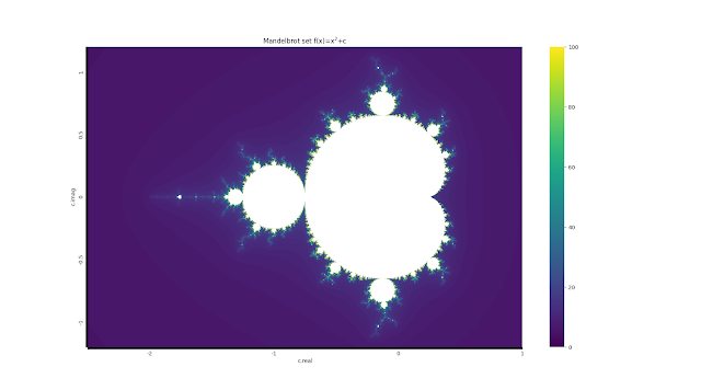1 2 3 4 5 6 7 8 9 10 11 12 13 14 15 16 17 18 19 20 21 22 23 24 25 26 27 28 29 30 31 32 33 34 35 import numpy as npimport seaborn as snsfrom matplotlib import pyplot as pltdef mdbt (c: complex ): f_x = 0 for i in range (200 ): f_x = f_x * f_x + c if abs (f_x) > 10e10 : return i return None x_list = [(x - 2500 ) / 1000 for x in range (3501 )] y_list = [(y - 1200 ) / 1000 for y in range (2401 )] z = np.zeros([3501 , 2401 ]) for x in enumerate (x_list): print (x[0 ]) for y in enumerate (y_list): z[x[0 ], y[0 ]] = mdbt(complex (x[1 ], y[1 ])) fig = plt.figure(figsize=(18 , 10 )) x_labels = ['' ] * 500 + ['-2' ] + ['' ] * 999 + ['-1' ] + ['' ] * 999 + ['0' ] + ['' ] * 999 + ['1' ] y_labels = ['' ] * 200 + ['-1' ] + ['' ] * 499 + ['-0.5' ] + ['' ] * 499 + ['0' ] + \ ['' ] * 499 + ['0.5' ] + ['' ] * 499 + ['1' ] + ['' ] * 200 sns.heatmap(z.transpose(), cmap='viridis' , xticklabels=x_labels, yticklabels=y_labels, vmax=100 , vmin=0 ).invert_yaxis() plt.xlabel('c.real' ) plt.ylabel('c.imag' ) plt.title('Mandelbrot set f(x)=x$^2$+c' ) plt.show()