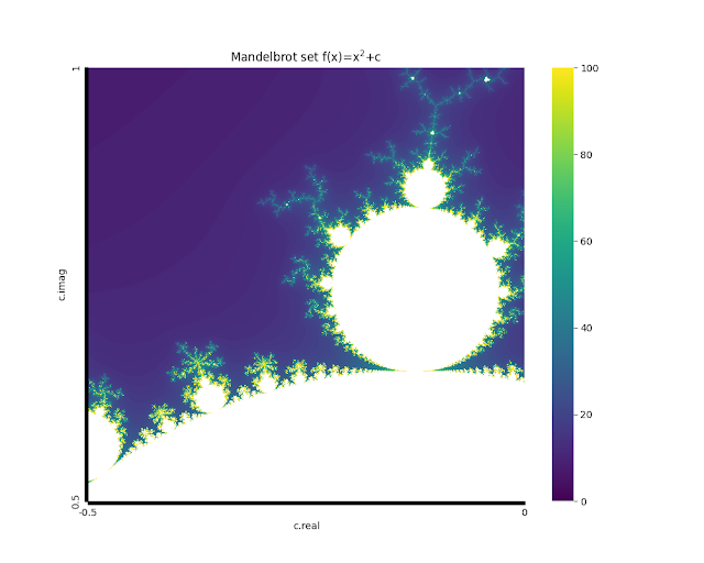 曼德勃罗集具有无限复杂的细微分形结构。稍微改动上述代码,即可放大绘制其局部。比如下图就是一个曼德勃罗集,其中c的实部在-0.5,