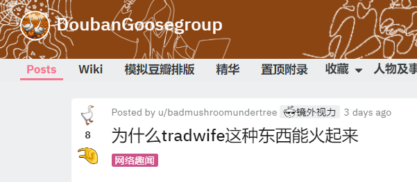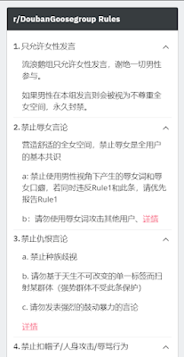 这里举一个reddit的DoubanGoosegroup群组(红迪豆瓣鹅组)的例子,作为极端女权言论的代表。大家也可以浏览这个群组里的一些帖子,感受一下“性别分离”的感觉: