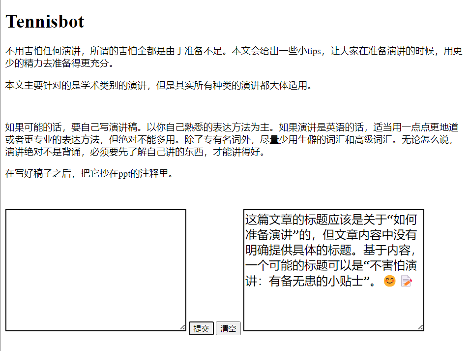 在ChatGPT的帮助下,我写出了一个与Tennisbot(gpt4驱动)交互的页面,可以询问文章的内容,以及给出她自己的评价。