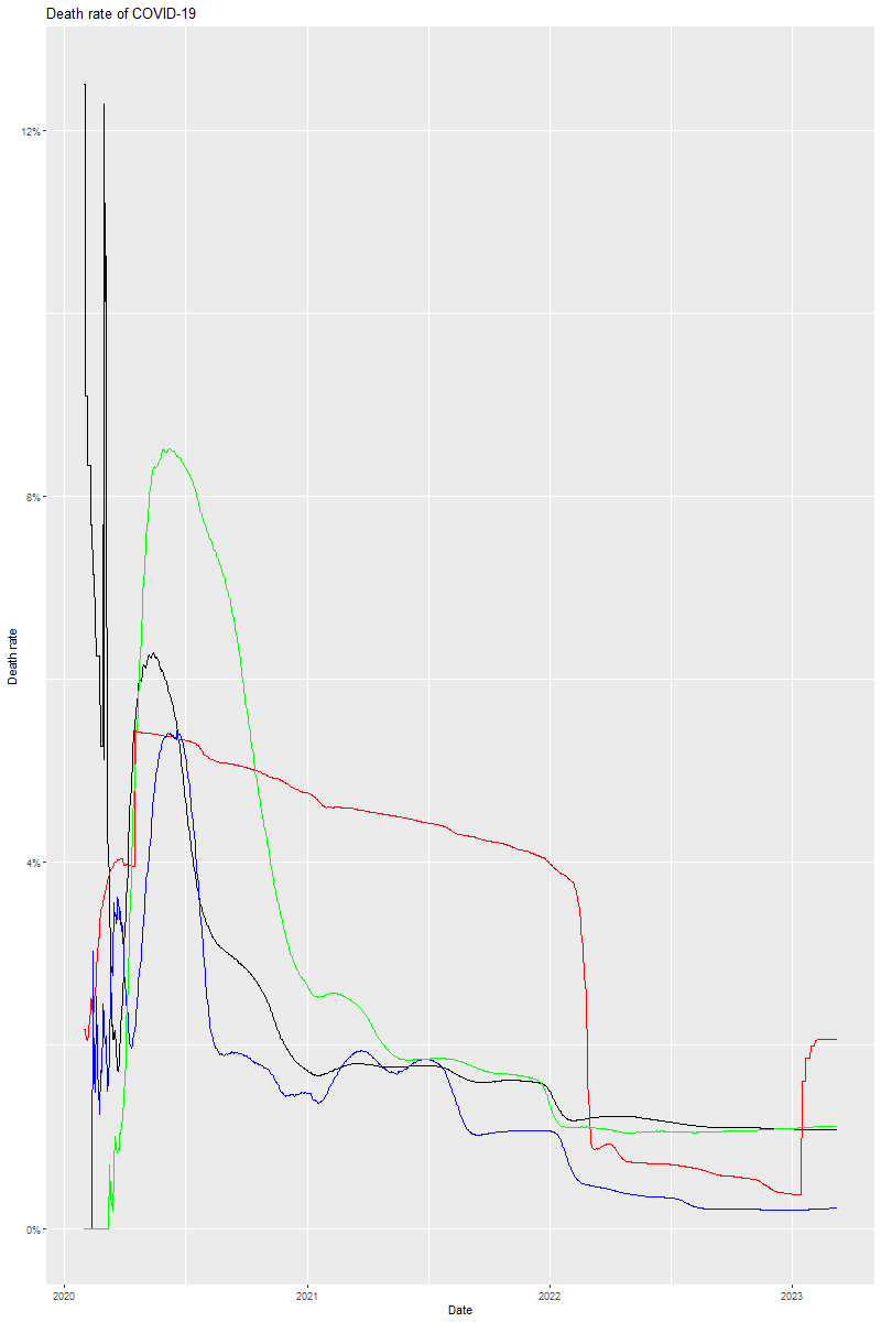 # 死亡率 - Death rate # 添加图例 - Add legend graph_death_rate <- ggplot(data)+ geom_line(aes(x = dates, y = us_death / us_conf), color ="black")+ geom_line(aes(x = dates, y = china_death / china_conf), color ="red")+ geom_line(aes(x = dates, y = japan_death / japan_conf), color ="blue")+ geom_line(aes(x = dates, y = canada_death / canada_conf), color ="green")+ scale_y_continuous(labels = scales::percent)+ labs(y ="Death rate", x ="Date", title ="Death rate of COVID-19")+