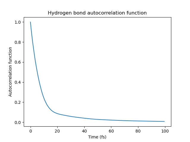 Finally, average the autocorrelation functions of all the hydrogen bonds and plot the result. The graph of the function is shown below (for the continuous hydrogen bond autocorrelation function).