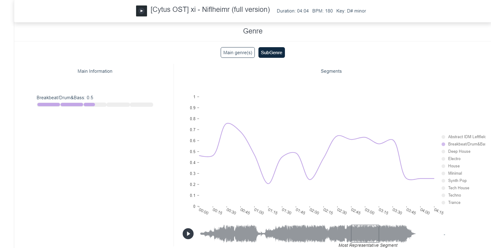 上传一首音乐,或者输入一个Youtube链接,cyanite会自动识别这首歌的风格,曲风,情感,使用的器乐。识别的还算准确吧。
