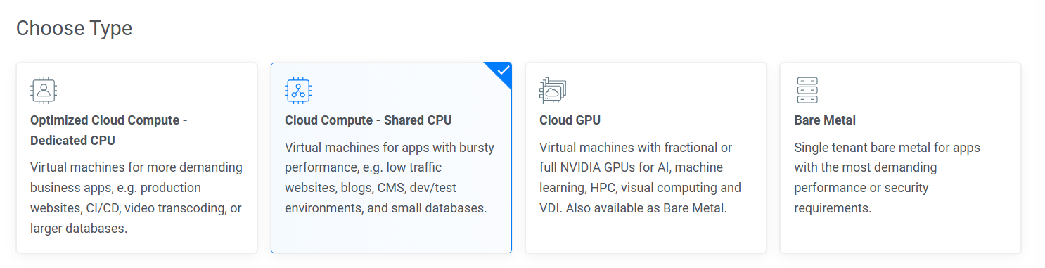 在Vultr主页,点击右上角的Deploy,选择服务器种类,因为SSR不会占用大量CPU资源,所以这里可以选择最便宜的Cloud Compute - Shared CPU。