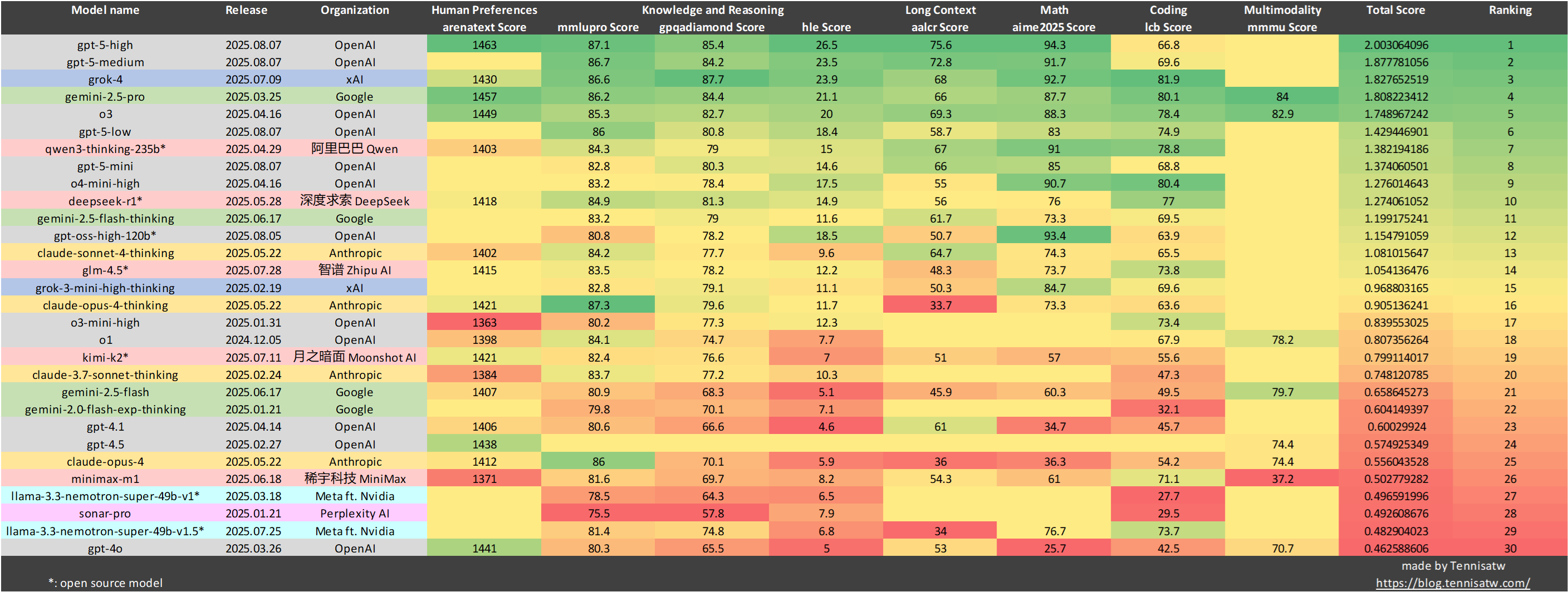 新发布的gpt5不出意外地拿到了第一名。都说gpt5的使用手感不如预期,文字生成能力不如gpt4.5,但是在各项能力上还是力压群雄。“既具有很高的原始性能(推理、数学),又具有很强的用户偏好分数(gpt5自评)” 只要有钱,无脑冲openai家的pro会员。